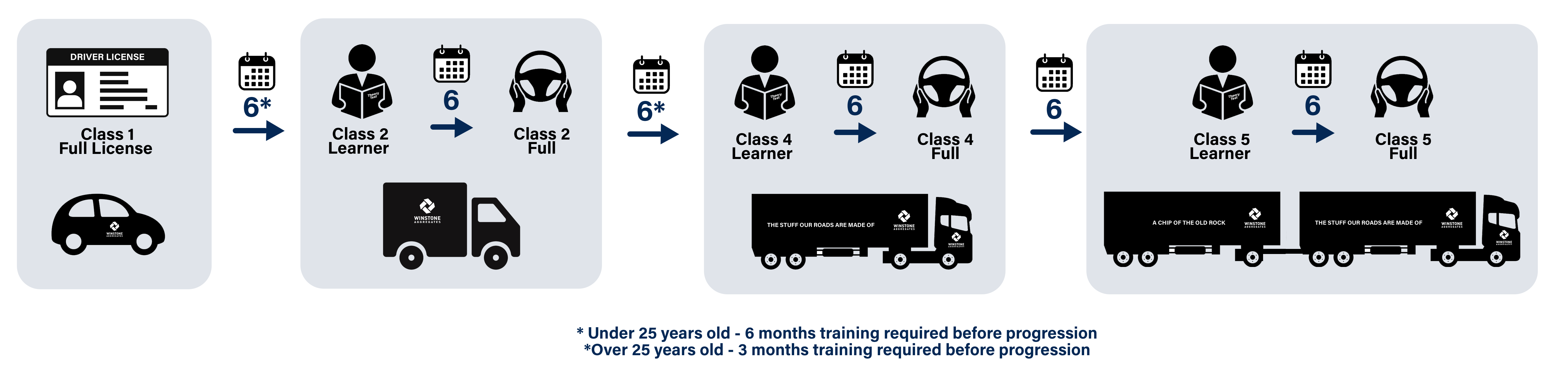 In this programme we take Class 2 licence drivers and upskill them to the Class 4 (heavy rigid vehicle) licence, or Class 5 (heavy combination vehicle licence). You get paid throughout the training process, with pay increases each time you qualify for a new licence Class.